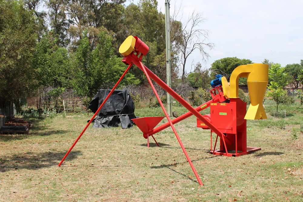 A radial Centrifugal fan is used to increase the kinetic energy in the air. The air duct is fitted with a controllable air damper to allow for adjusting and controlling the correct amount of air needed to blow and separate the Husk and Germ from the Maize Kernel. The Husk and Germ are blown into a Cyclone where it is bagged. Much as effective is a 180°outlet chute that delivers same into bags or Conveying Auger.